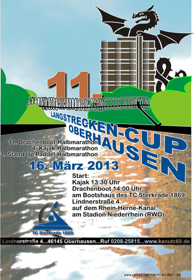 Am Samstag, 31.03.2012, fand der 10. Langstrecken-Cup der Kanuabteilung des TC Sterkrade 1869 über 21km statt.Trotz wechselhaftem Wetter unterstützen hunderte Fans und Zuschauer diesen Frühjahrsklassiker am Rhein-Herne-Kanal in Oberhausen, der mit der Teilnahme von 13 Drachenbootteams und 22 Kanuten aus dem gesamten Bundesgebiet aufwarten konnte.