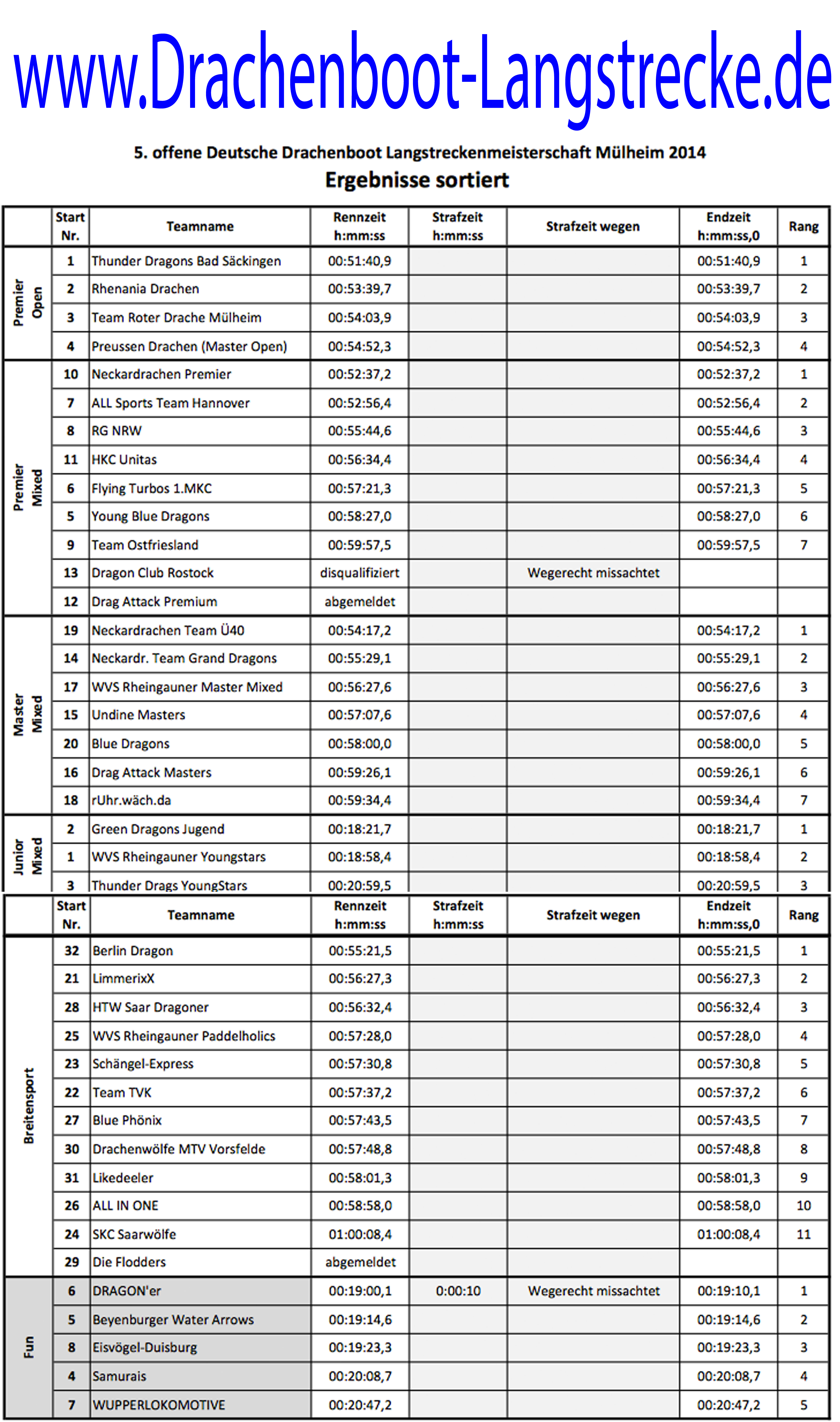 Die Berlin Dragons des Kanu-Team-Berlin konnten nach dem zweiten Platz im Vorjahr den Sieg bei der Bestenermittlung im Breitensport erkämpfen. Das Teams Limmerixx des Kanu-Club Limmer kam mit einer Minute Rückstand als zweit Platzierter ins Ziel, nur fünf Sekunden später die HTW Saar Dragoner des 1. Drachenbootverein Saar.